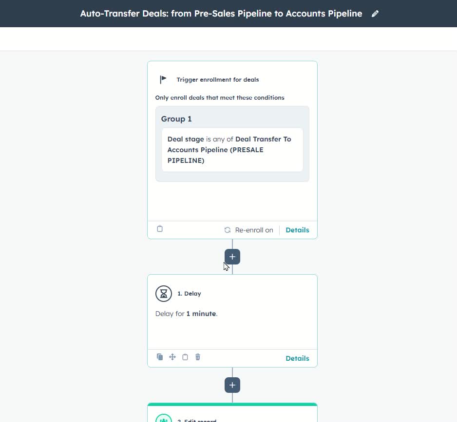 בנוסף, אוטומציה מאפשרת למנהלי מכירות ולמנכ"לים לראות תמונה עדכנית ומדויקת של כל שלב בתהליך – החל משלב ליד נכנס ועד לסגירת עסקה.באמצעות האוטומציות בהאבספוט ניתן גם לשלב בין מערכות שונות: לדוגמה, כאשר דיל עובר מפייפליין של מכירה לפייפליין של גבייה, ניתן להפעיל במקביל אוטומציה ששולחת הודעה למחלקת הכספים, מעדכנת את הלקוח, ומייצרת משימה לנציג השירות.